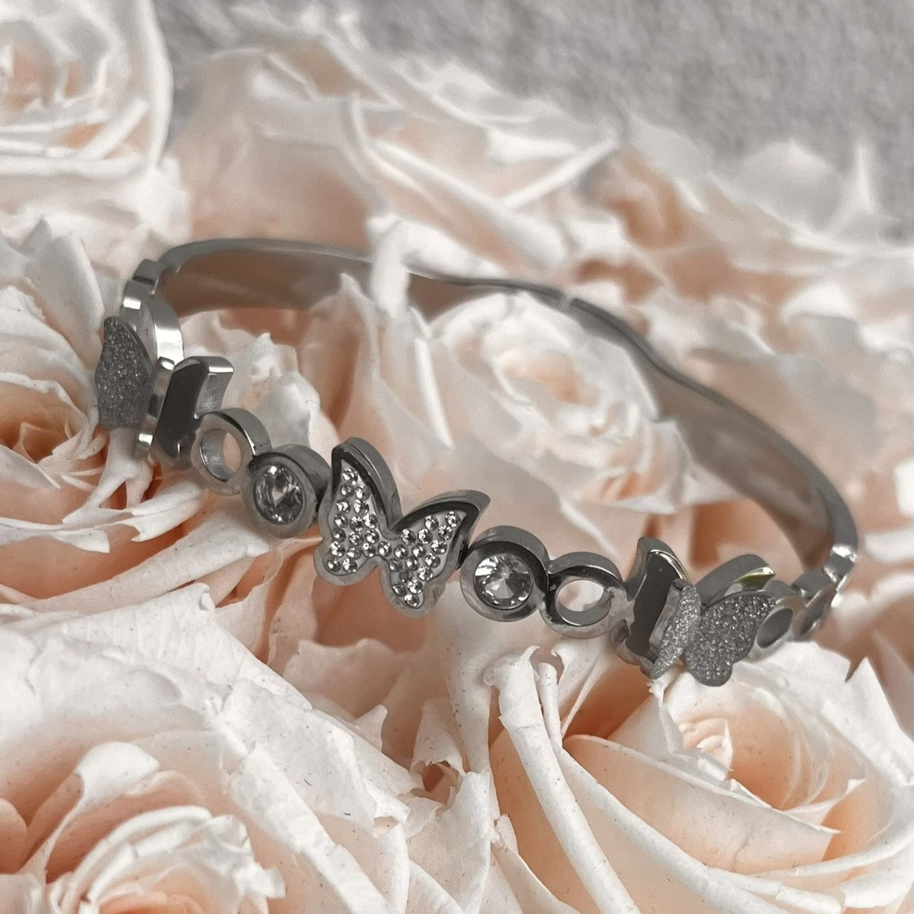 Edelstahl Armreif mit funkelnden Schmetterlingen & Strass