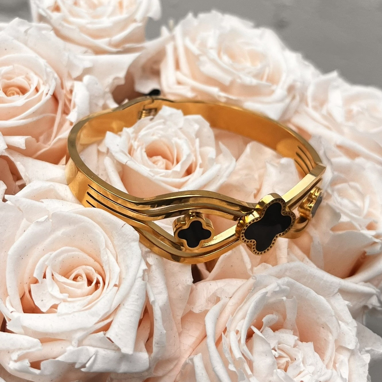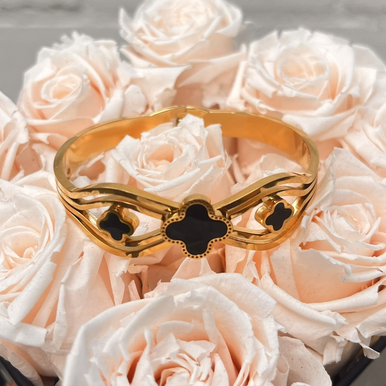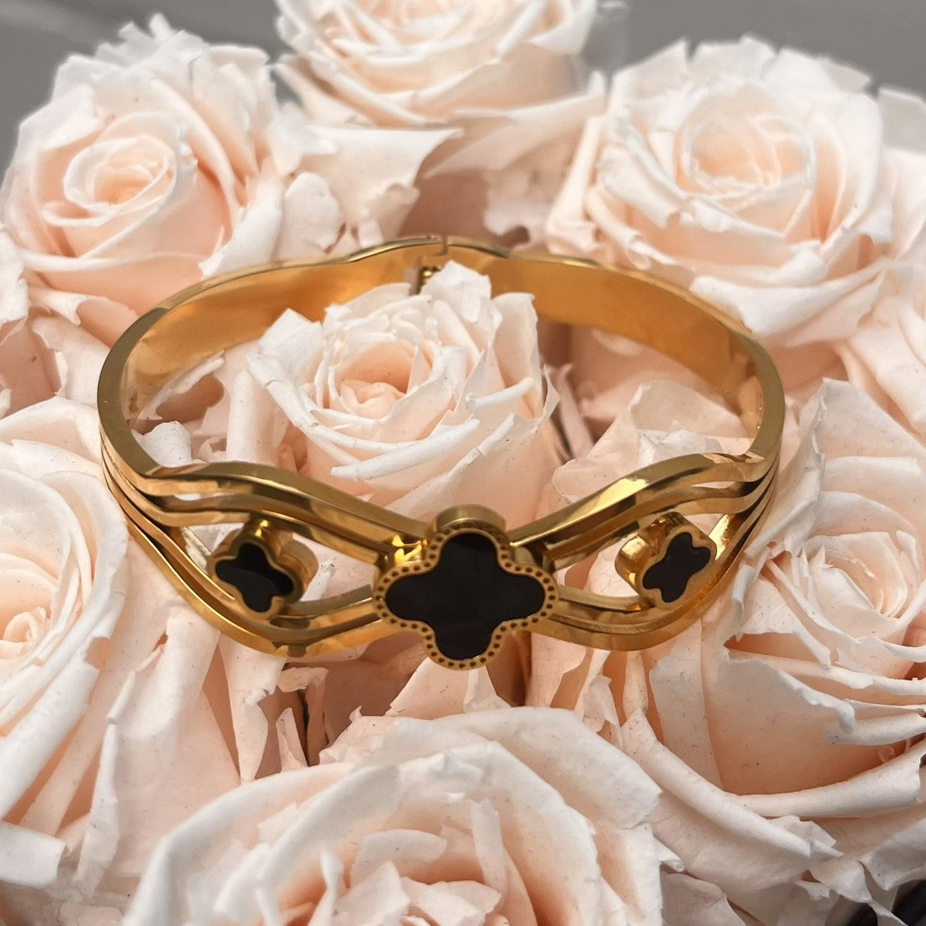 Goldfarbener Edelstahl Armreif mit 3 schwarzen Kleeblättern
