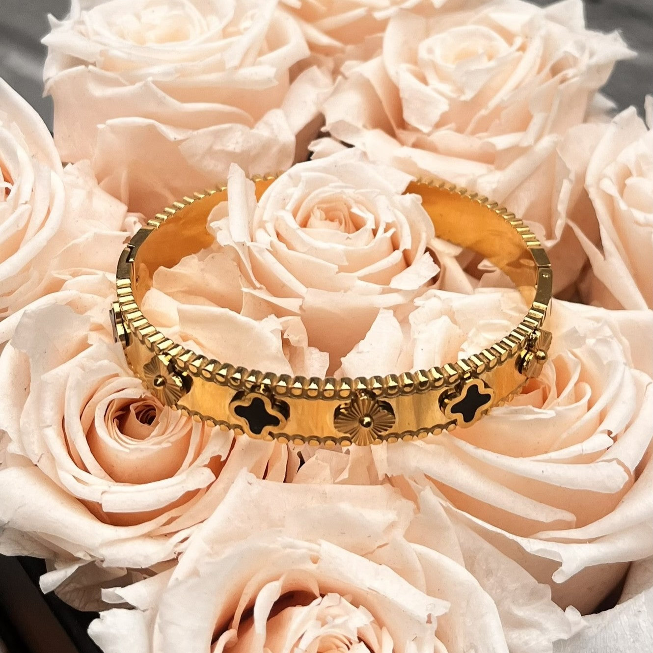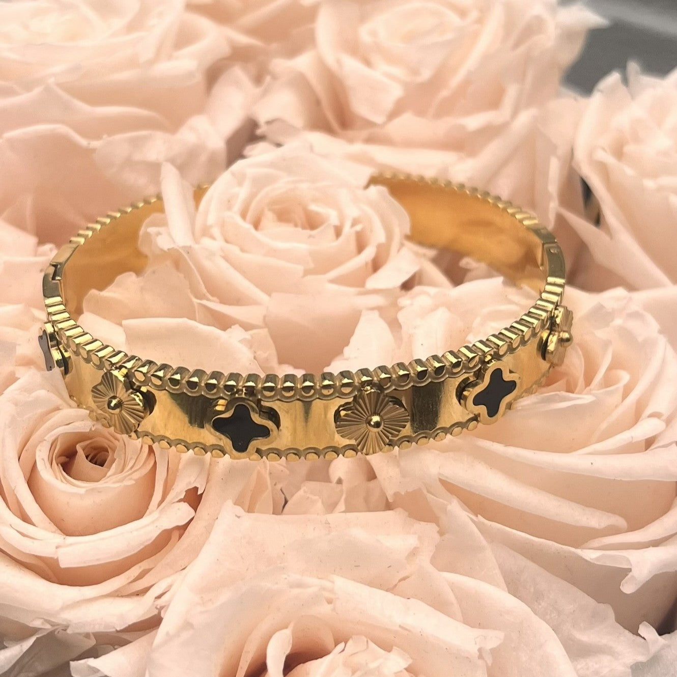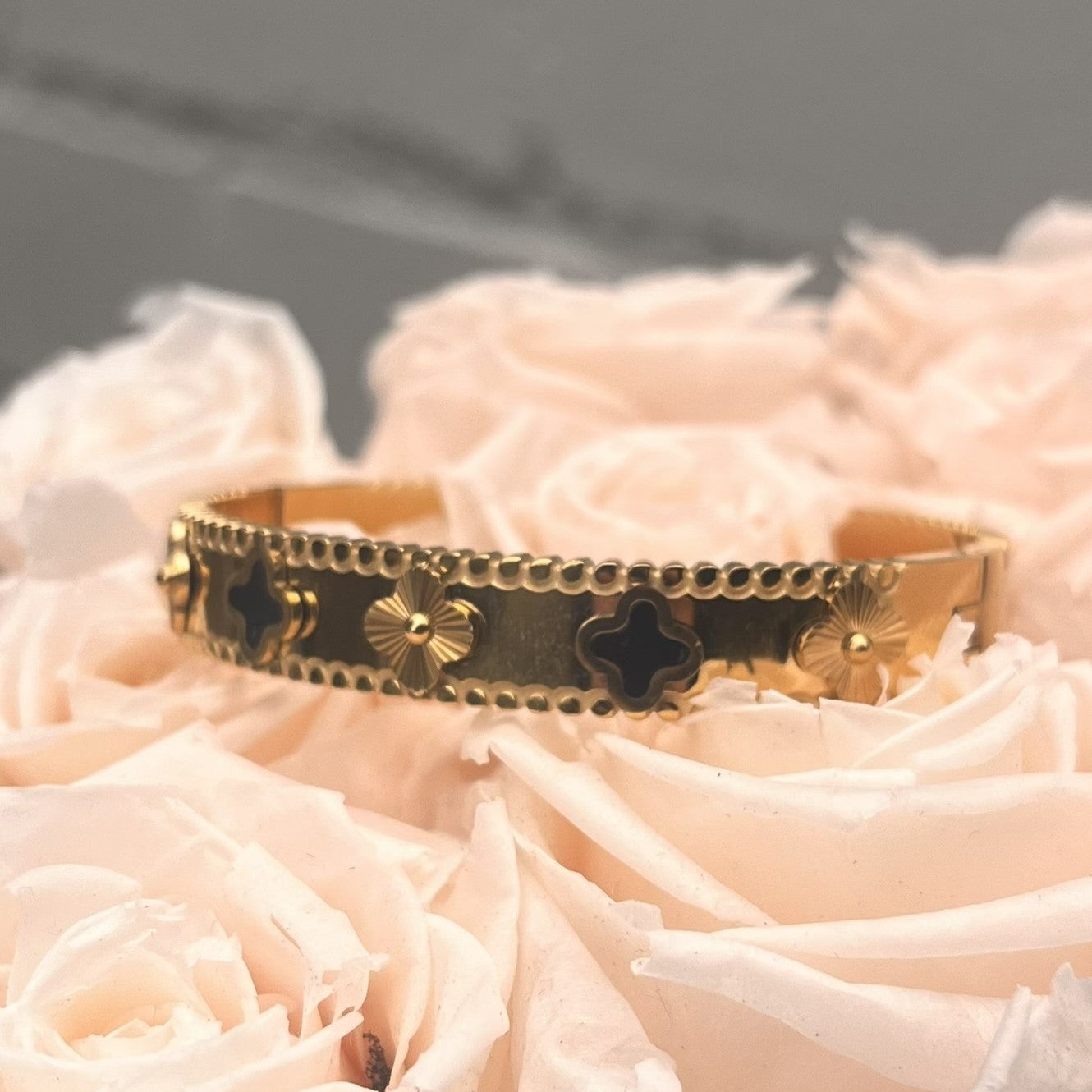 Vergoldeter Edelstahl Armreif mit Ornament-Details & schwarzen Akzenten